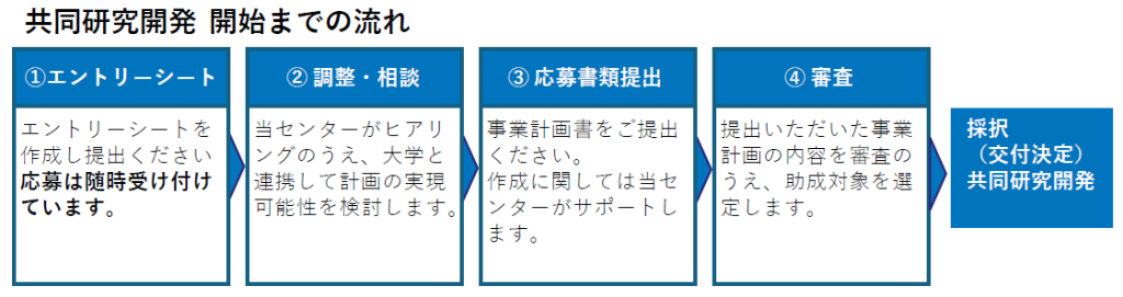 エントリー後に当センターでヒアリングの上、事業計画と共同研究の調整・相談を行い、事業計画書を作成および提出していただきます。提出された事業計画と共同研究開発は、庄内地域産業振興センターが設置する審査会にて審査を行います。その上で採択または不採択を決定します。