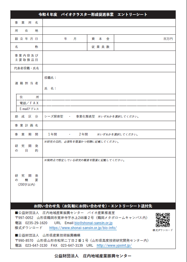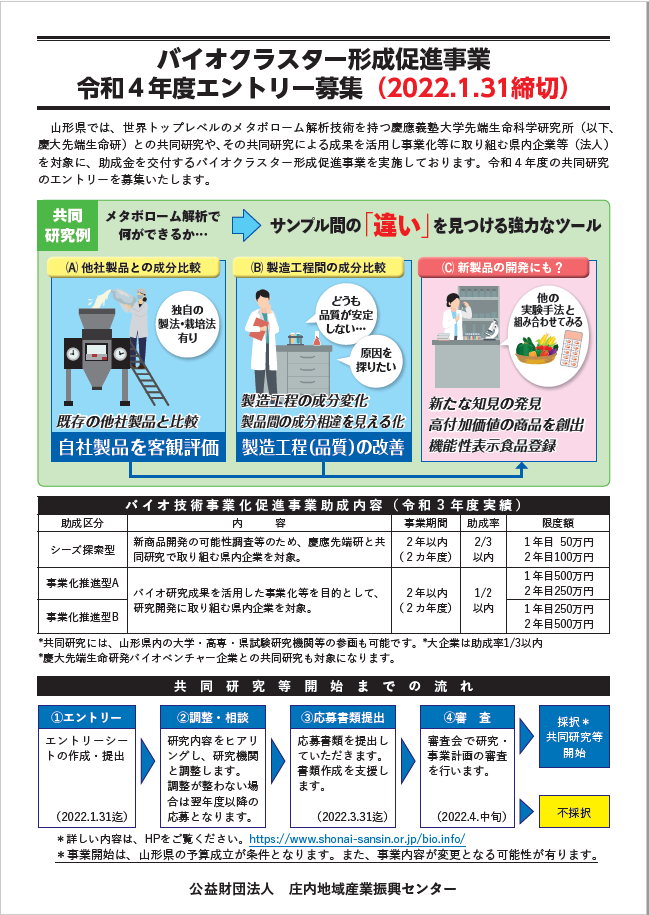 (公財)庄内地域産業振興センターでは、世界トップレベルのメタボローム解析技術を持つ慶應義塾大学先端生命科学研究所等との共同研究やその共同研究による成果を活用した新製品開発等に取り組む県内企業等(法人)を対象に助成金を交付する、バイオクラスター形成促進事業を実施しております。