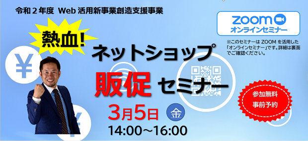 【「ネットショップ販促セミナー」への参加申込について】 このセミナーは、Web会議システム「ZOOMミーティング」によりオンラインで開催致します。 参加申込は、インターネットからお願いいたします。