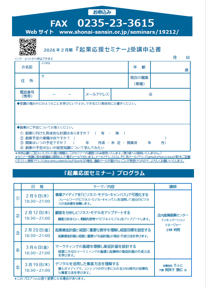 <特定創業支援の要件> 本セミナー全日程のうち4回以上受講し、その後庄内産業振興センターの創業個別相談(複数回)を受けた方