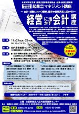 第1 講 11月21日(水)【財務諸表について理解する】 講師:原田税理士事務所 所長 税理士 原田 洋 氏 ・貸借対照表(B/S)で何がわかるのか ・損益計算書(P/L)で何がわかるのか ・財務分析による決算書活用方法 ・経営の今「財務会計」と未来「管理会計」 第2 講 11月28日(水)【利益のみえる会計 MQ会計を理解する】 講師:合資会社そふと 代表社員 我孫子 勝広 氏(山形県よろず支援拠点庄内サテライトコーディネータ) ・MQ会計とは(MQ会計の要素) ・損益分岐点は複数ある(利益感度分析) ・「経営は逆算」会計思考で経営シミュレーション(演習) 終了しました。 |